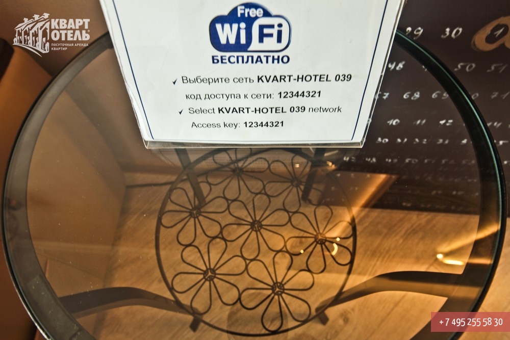 Безлимитный, беспроводной высокоскоростной Wi-Fi доступ в интернет (для подключения Вам необходимо иметь собственный ноутбук). Телефон в квартире с безлимитным доступом на городские номера телефонов Москвы в коде «495».