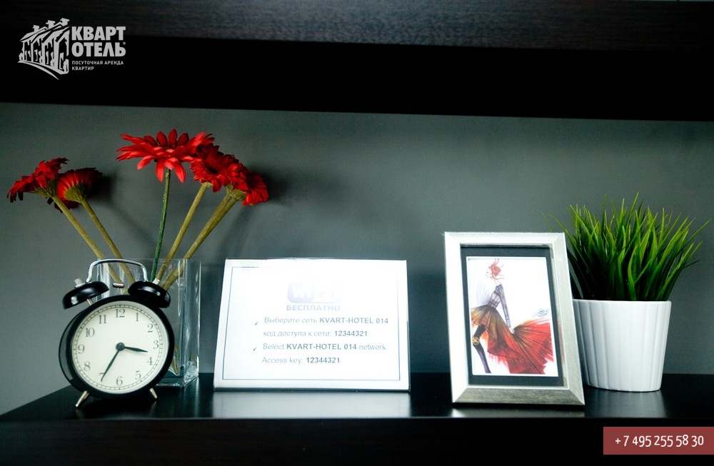 Безлимитный, беспроводной высокоскоростной Wi-Fi доступ в интернет (для подключения Вам необходимо иметь собственный ноутбук). Телефон в квартире с безлимитным доступом на городские номера телефонов Москвы в коде «495».