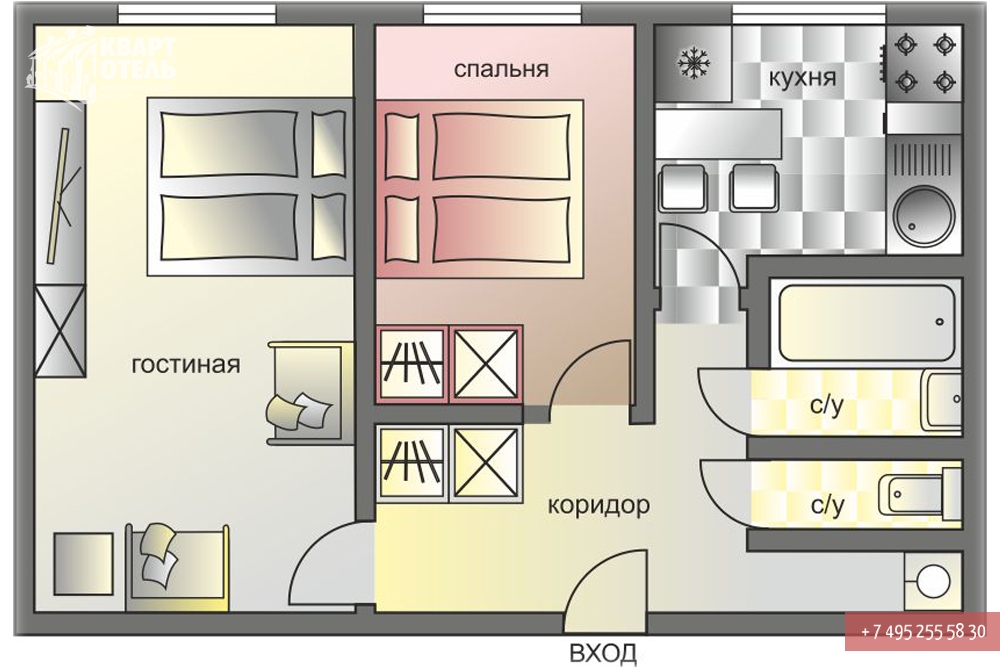 Забронировать эту квартиру Вы можете в службе бронирования по телефону +7 (495) 255 58 30 в будни с 9 до 20 часов, в выходные и праздничные дни с 10 до 18 часов. Оплатить проживание можно безналичным перечислением на наш расчетный счет, наличными в офисе или при заселении на квартире, платежными картами VISA, MasterCard, электронным переводом по системе Яндекс-Деньги. Более подробную информацию о бронировании и способах оплаты Вы можете получить в разделах Услуги и Оплата и скидки.