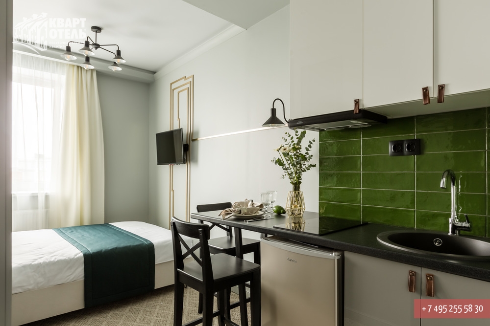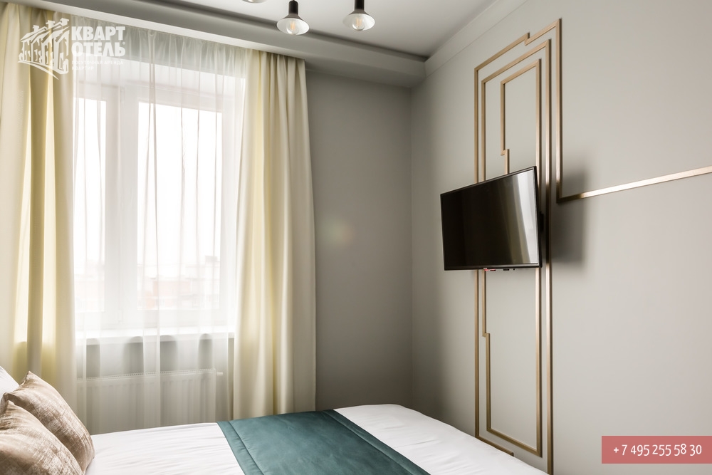 Квартира предназначена для проживания 1 человека при размещении на отдельных спальных местах или 2 человек при совместном размещении на двуспальных местах. В квартире: одна двуспальная кровать.